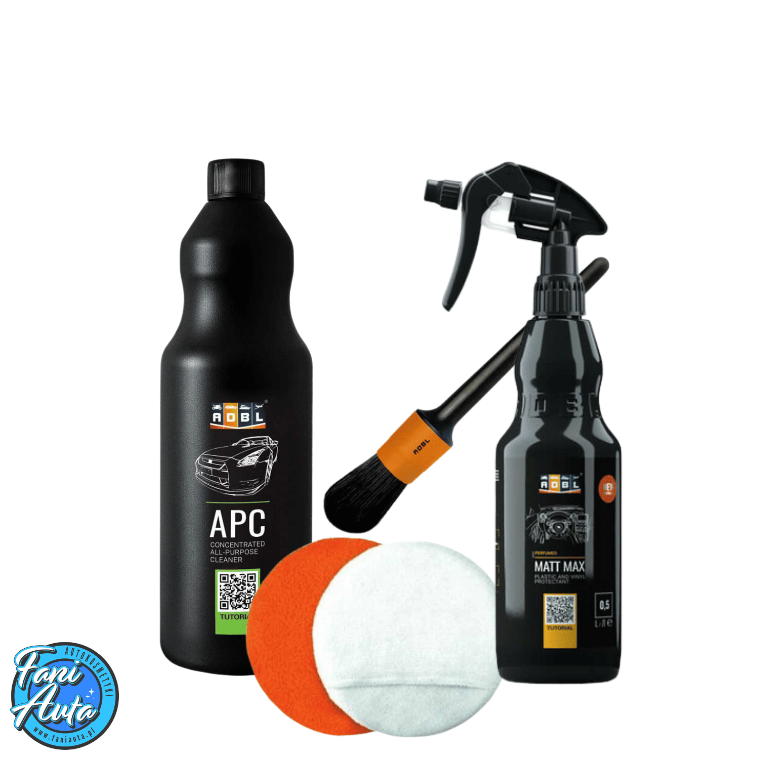 - Zestaw ADBL do pielęgnacji wnętrza samochodu to kompleksowe narzędzie do efektywnego czyszczenia i konserwacji. W jego skład wchodzi uniwersalny środek czyszczący, aplikator, matowy dressing oraz pędzel detailingowy, które gwarantują doskonałe rezultaty.
