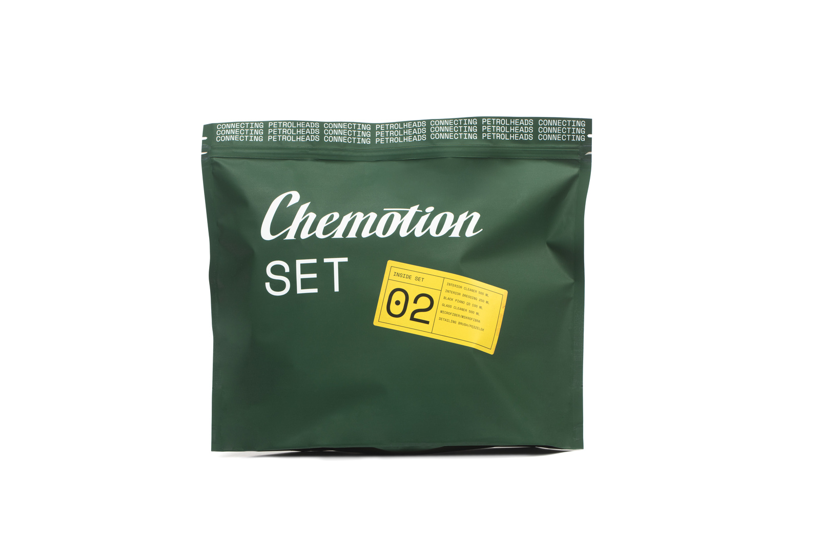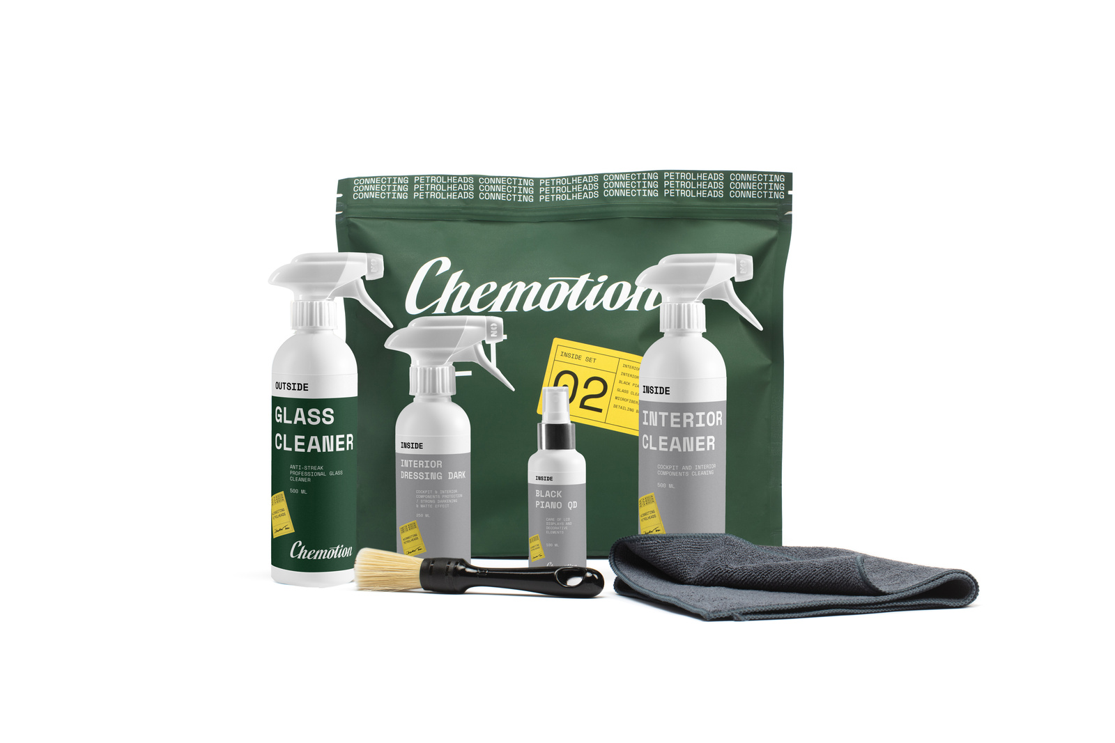 - Zestaw Chemotion Inside Set 02 to kompletne rozwiązanie do pielęgnacji wnętrza auta. W środku znajdziesz preparaty do czyszczenia kokpitu, szyb, ekranów oraz elementów z tworzyw sztucznych. Praktyczny i estetyczny – sprawdzi się także jako prezent.