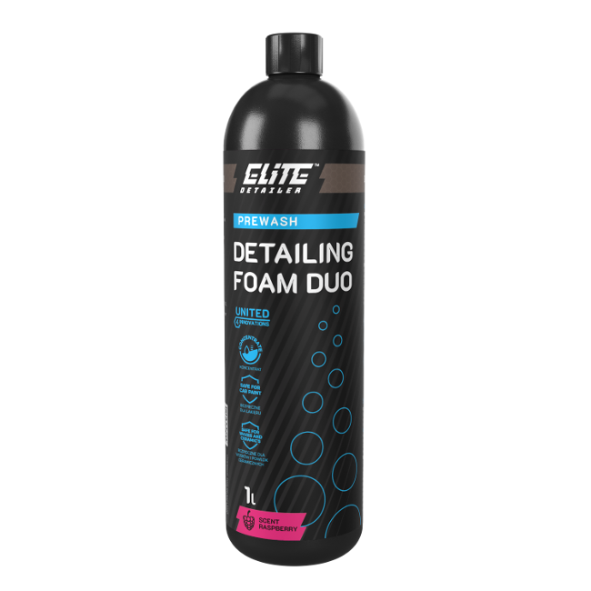 • Elite Detailer Detailing Foam Duo to aktywna piana o neutralnym pH i zapachu malin. Skutecznie usuwa zabrudzenia, tworzy gęstą pianę i nie szkodzi lakierowi ani powłokom.