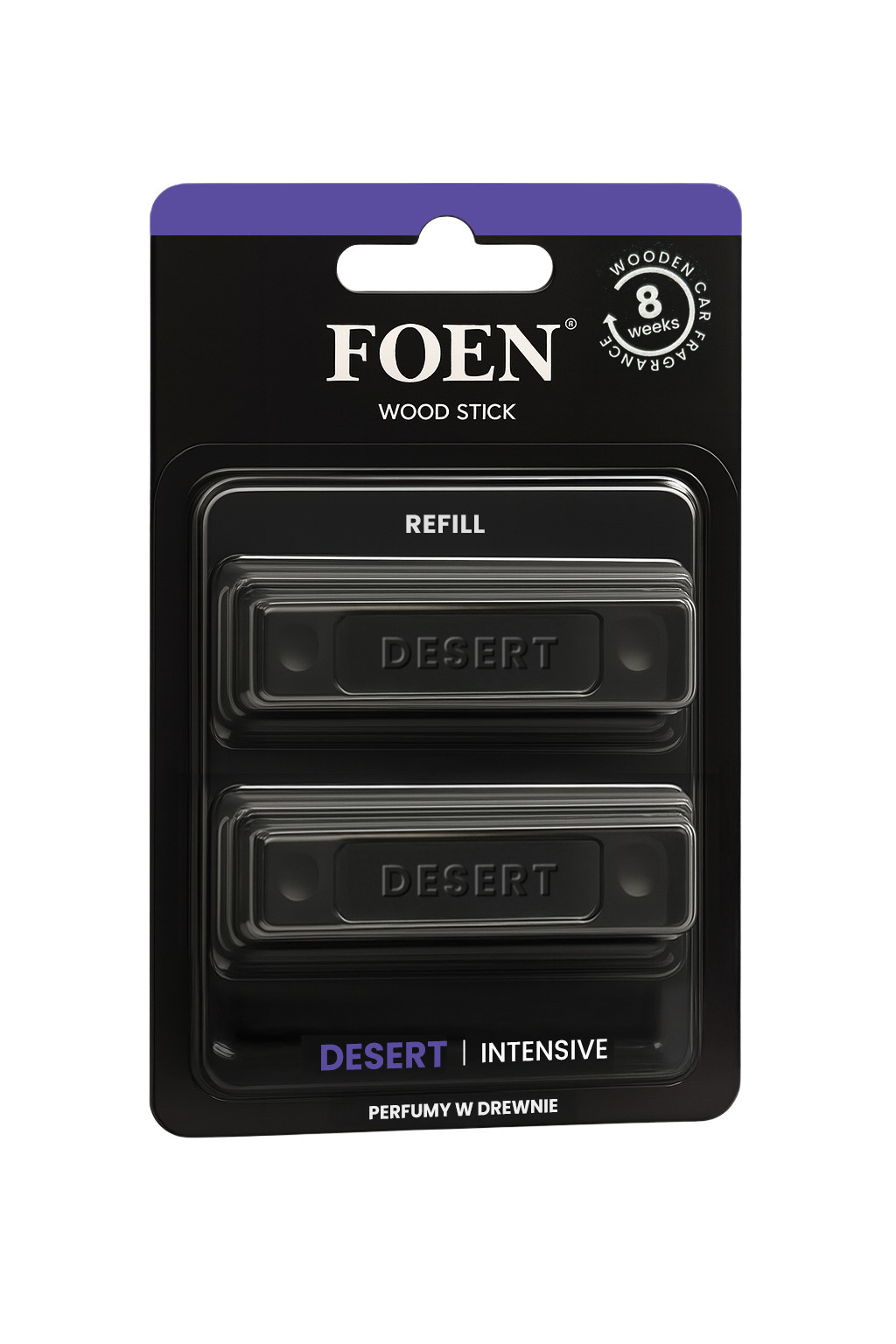- Foen Wood Stick Desert to perfumy samochodowe w drewnianej formie o orientalnym charakterze. Łączą nuty jaśminu, przypraw, orchidei i bursztynu, tworząc elegancki i wyjątkowy zapach. Naturalny design nadaje wnętrzu stylu, a trwałość sięga nawet 8 tygodni.