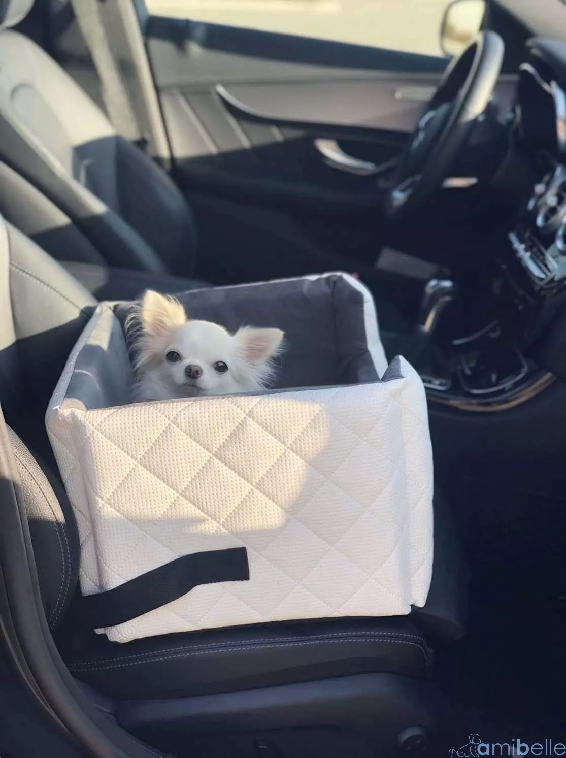- Amibelle Mia to elegancki fotelik samochodowy dla psa z usztywnianymi ściankami, miękkim wnętrzem i estetycznym wykończeniem. Chroni tapicerkę, łatwy w montażu i pielęgnacji.