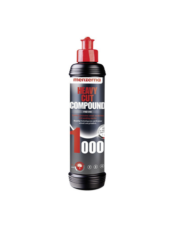 - Menzerna Heavy Cut Compound 1000 to pasta polerska przeznaczona do usuwania głębokich rys i poważnych defektów lakieru. Zapewnia skuteczną korektę przy niskim pyleniu i nie zawiera silikonu.